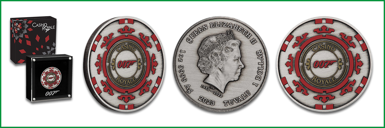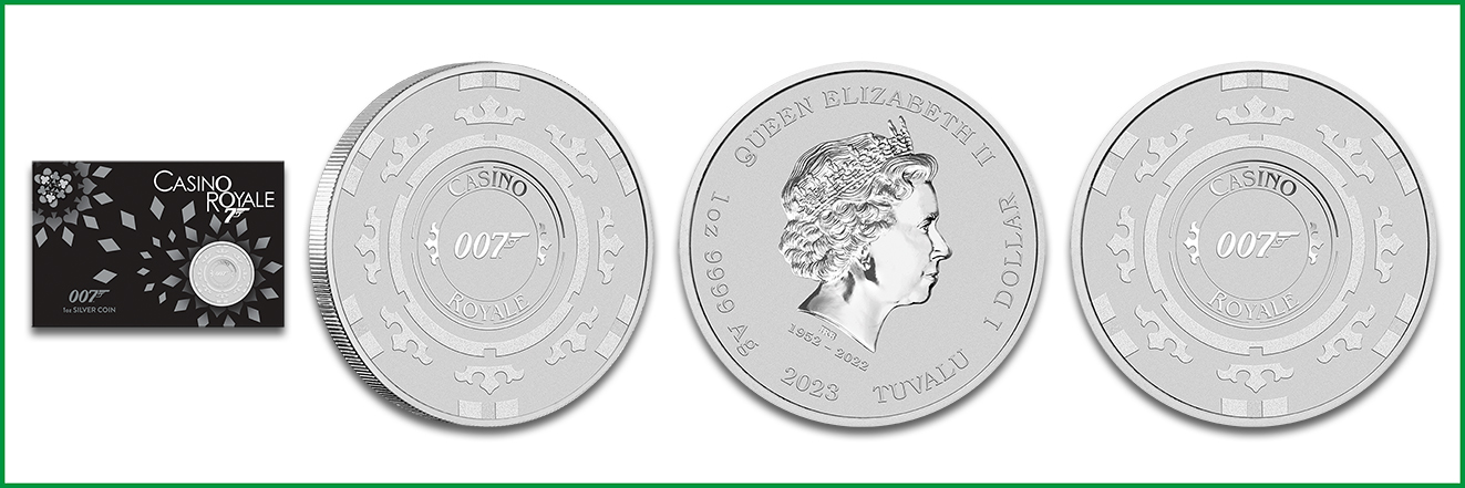 Im klassischen Pokerchip-Design von Sean Rogers präsentieren sich die beiden Silbermünzen aus der James Bond-Kollektion der Perth Mint. Sie zeigen auf ihrer Bildseite das ikonische 007-Waffenlogo sowie den Schriftzug »Casino Royale« aus dem gleichnamigen Film von 2006. Die Vorderseite ist den Münzdaten sowie dem bekannten Queen-Portrait von Ian Rank-Broadley gewidmet. Erhältlich sind die Münzen nur in der Einheit zu einer Unze mit Nennwert über 1 Tuvalu-Dollar. Ihr Feingehalt beläuft sich auf 999,9 Tausendstel. Der Durchmesser beträgt 40,9 x 3,5 Millimeter Randstärke.