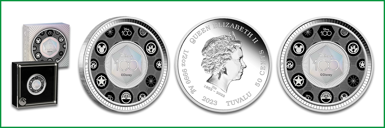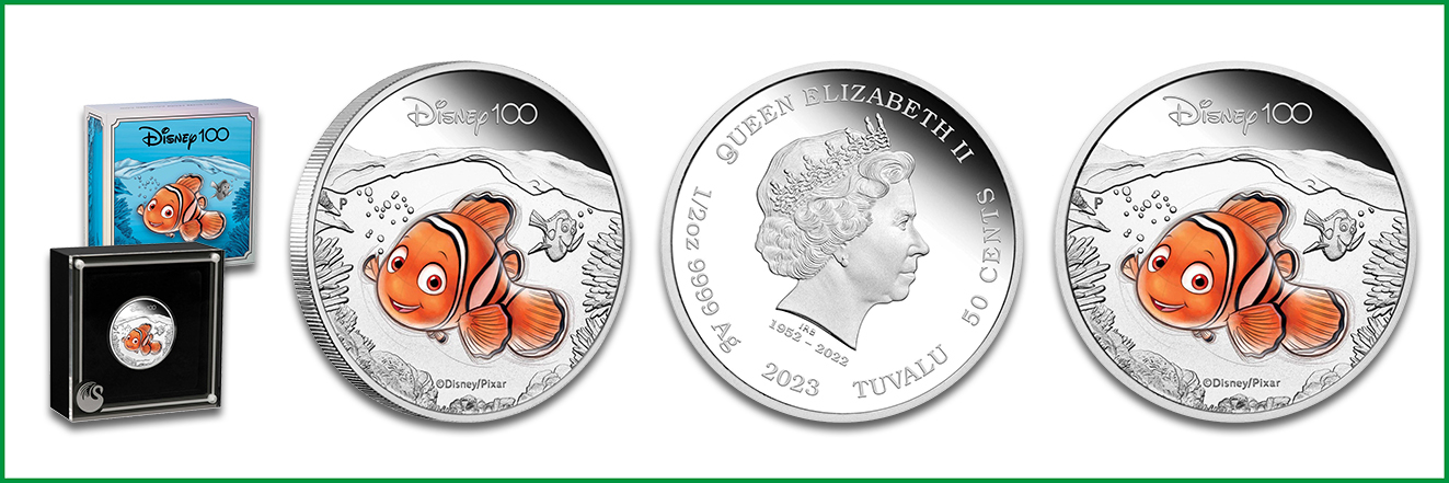 Mit einer Serie aus Sammlermünzen zelebriert die Perth Mint das 100. Jubiläum von Walt Disney. Zwei goldfarbene Münzen aus Basismetall zeigen die Motive Mickey Mouse und Minnie Mouse. Darüber hinaus sind ebenfalls zwei Farbmünzen zu 1/2 Unze erhältlich, die aus 999,9/1000 Silber bestehen. Sie zeigen ein hologrammfarbenes Disney-Logo, das von runden Symbolen aus der Disney-Welt umgeben ist, sowie ein Motiv aus dem Film »Findet Nemo«. Beide Rückseitenmotive wurden von Sean Rogers entworfen. Die Vorderseiten präsentieren das Memorial-Relief von Queen Elisabeth II. nach Ian Rank-Broadley zusammen mit den Münzdaten.