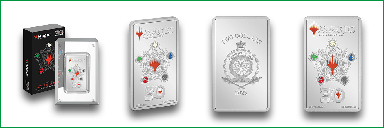 Mit einem Silbermünzbarren feiert die Perth Mint das 30. Jubiläum des beliebten Sammelkartenspiels »Magic: The Gathering«. Die Rückseitengestaltung ist den Spielkarten nachempfunden. Sie zeigt das charakteristische Fünfeck mit den wählbaren Symbolen und Farben. Integriert sind das Magic-Logo und die Jubiläumszahl 30. Die Vorderseite trägt das Landeswappen des Ausgabestaates Niue sowie den Nennwert über 2 Neuseeland-Dollar und das Erscheinungsjahr.
