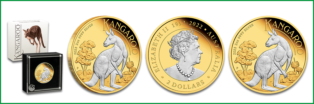 Aus der Serie Australian Kangaroo veröffentlicht die Perth Mint eine weitere Sonderprägung. Es handelt sich um eine Silbermünze zu 2 Unzen, die eine 24-karätige Hintergrund-Vergoldung aufweist, während die Hauptmotive von Vorder- und Rückseite in Silber gehalten sind. Der Revers zeigt das 2023er-Motiv der Känguru-Goldmünzen von Ing Ing Jong mit dem einzelnen stehenden roten Riesenkänguru. Auf dem Avers erscheint das Memorial-Portrait von Queen Elizabeth II.
