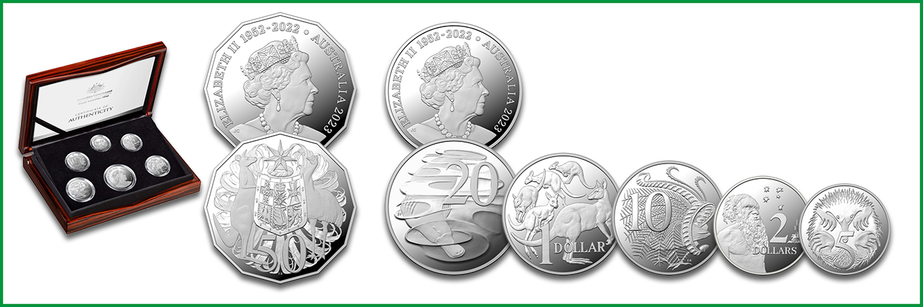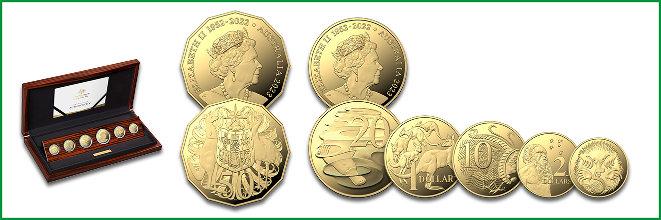 Die Royal Australian Mint hat zwei neue Münzensets in Gold und Silber herausgegeben. Dabei handelt es sich um jeweils sechs Münzen, welche die Designs von Australiens ikonischen Umlaufmünzen repräsentieren. Entworfen wurden sie von den Münzdesignern Stuart Devlin und Horst Hahne. Sie bestehen aus 999,9/1000 Gold sowie aus 999/1000 Silber und sind auf Polierter Platte mit mattierten und polierten Oberflächen geprägt, sodass ein moderner 3D-Effekt entsteht. Auf den Vorderseiten ist das Gedächtnis-Portrait Queen Elizabeth II. mit ihren Regentschaftsjahren 1952 bis 2022 zu sehen sowie das aktuelle Erscheinungsjahr.