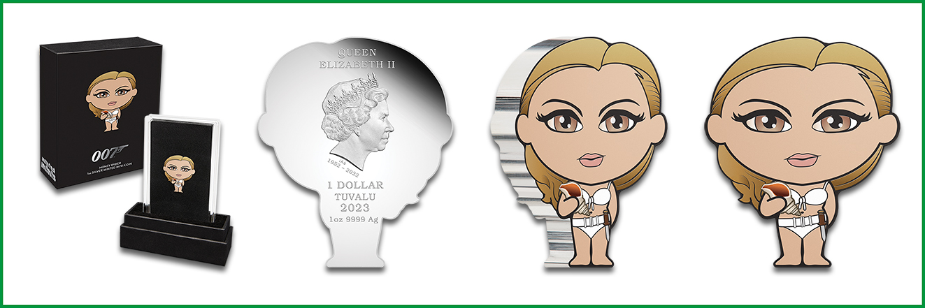 Weiterhin gibt die Perth Mint ein neues Sammlerstück für Fans des britischen Geheimagenten James Bond heraus. Es handelt sich um die Figur der Honey Ryder, gespielt von Ursula Andress aus dem ersten Bond-Film »Dr. No« von 1962. Die Silberfarbmünze ist Teil des Programms der »Silver Minted Mini Coins« mit Motiven aus der Fantasy-, Film- und Comicwelt. Die Figurenmünze zeigt den Charakter mit einem weißen Bikini bekleidet und mit Tauchermesser am Gürtel. In der Hand hält sie ein Muschelhorn. Für die Design-Adaption zeichnet der Künstler Lucas Bowers verantwortlich. Der silberfarbene Avers zeigt das Emblem von Queen Elizabeth II. nach Ian Rank-Broadley.