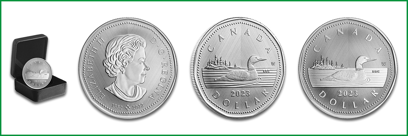 Aus der neuen W-Mint-Mark-Serie, die Kanadas Umlaufmünzen würdigt, kommt die Silbermünze »Loon« auf den Markt. Ausgegeben wird sie von der Royal Canadian Mint mit dem Münzzeichen W für das Prägewerk in Winnipeg. Vorder- und Rückseite der Münze sind so gestaltet, dass sie wie ein 12-Eck erscheint. Der Revers stellt einen Seetaucher dar als Synonym für den kanadischen Dollar. Die gewinkelten Linien des Wassers wurden vom pyramidenförmigen Gebäude der Winnipeg Mint inspiriert. Entworfen wurde das Design von Robert-Ralph Carmichael (RRC). Integriert sind Jahrgang und Dollar-Schriftzug. Den Avers ziert einmal mehr Queen Elizabeth II., in dieser Darstellung kreiert von Susanna Blunt (SB).