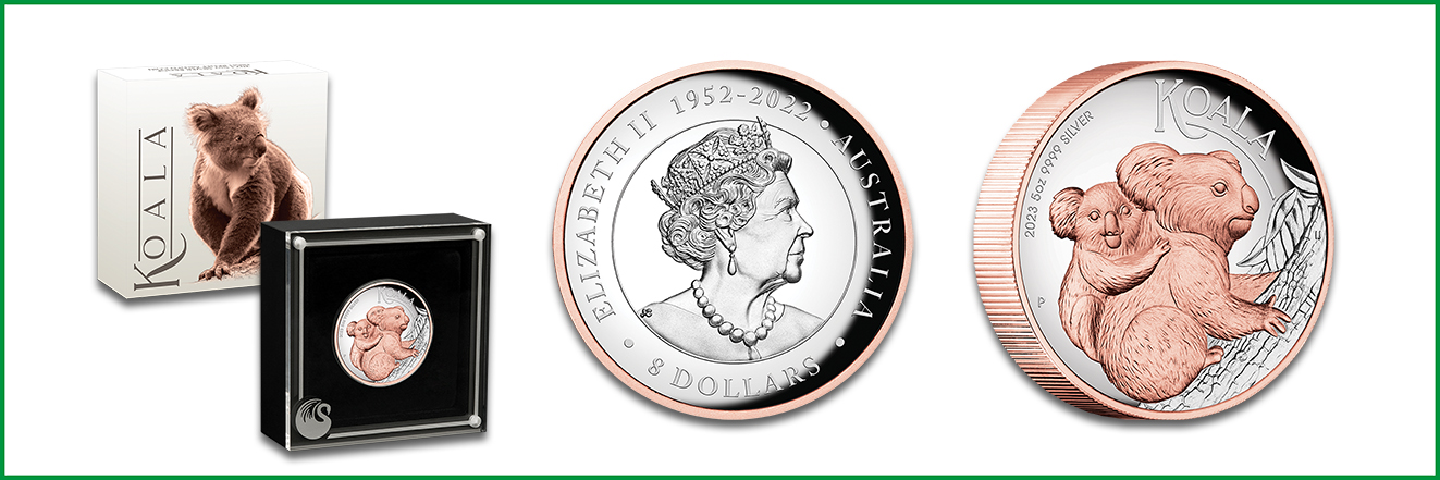 Aus der Serie Australian Koala verausgabt die Perth Mint eine limitierte Silbermünze zu 5 Unzen im Hochreliefdesign. Dabei erscheinen das Koalamotiv der Rückseite und der geriffelte Rand mit einer 22-karätigen Echtgoldauflage. Als Basis dient das diesjährige Abbild der Koalabärin mit ihrem Jungtier auf dem Rücken, das von der Künstlerin Ing Ing Jong (IJ) gestaltet wurde. Wie für diesen Jahrgang üblich befindet sich auf dem Avers das Memorial-Emblem mit Queen Elizabeth II. von Jody Clark. Im Außenring ist zudem der Nennwert über 8 Australische Dollar enthalten.