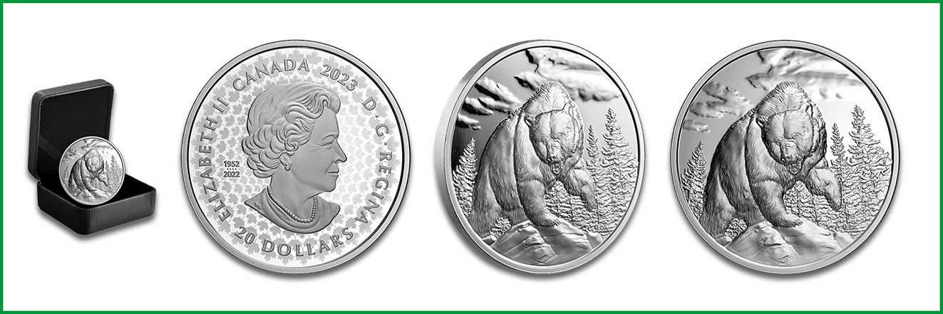 Ebenfalls aus der Kollektion der Royal Canadian Mint stammt diese Silbermünze als Ultrahoch-Relief-Prägung. Sie ist dem kanadischen Grizzlybären gewidmet, dem Symbol für Stärke und Macht. Dargestellt ist das Raubtier in seiner natürlichen Umgebung, den westlichen Wäldern Kanadas. Entwickelt wurde das Design von Emily Damstra (ED). Das Motiv begründet die neue Münzserie Great Hunters (Großartige Jäger). Die Wertseite stellt das Queen-Portrait von Susanna Blunt vor einem Hintergrund mit Ahornblatt-Muster dar. In der Umschrift sind Erscheinungsjahr und Nennwert über 20 Kanadische Dollar (CAD) integriert.