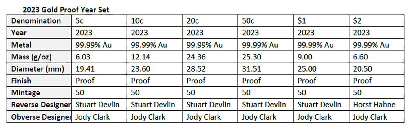 Die Münz-Jahressets 2023 beinhalten die Motive 5, 10, 20 und 50 Cent sowie 1 und 2 Dollar. Das entspricht zugleich ihrem Nennwert, wodurch die Münzen offizielle Zahlungsmittel Australiens sind. Präsentiert werden die Münzkollektionen in eleganten Klappetuis mit nummerierter Plakette und Echtheitszertifikat. Das Goldmünzenset hat eine streng limitierte Auflage von nur 50 Stück. Das Silbermünzenset umfasst 1.000 Exemplare. Die Gold- und Silbermünzen sind nur im Set erhältlich und werden nicht einzeln angeboten.