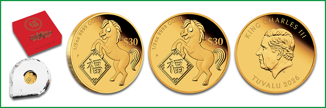 Im verspielten Design von Jennifer McKenna präsentiert sich die Goldmünze zu 1/5 Unze aus der »Chinese Astrological Serie« der Perth Mint. Das Motiv zeigt eine Pferde-Karikatur, die ein Frühlingsfestspruch mit dem chinesischen Schriftzeichen “Fu” (Wohlstand) trägt. Integriert ist der Nennwert über 60 Tuvalu-Dollar (TVD). König Charles III. ziert die Wertseite, die von Jody Clark entworfen wurde. Die Sammlermünze auf polierter Platte hat die Abmessungen 22,6 x 1,9 Millimeter und einen Goldfeingehalt von 999,9 Tausendstel. Die Gesamtauflage von 4.000 Stück wird im Acryl-Display verausgabt.