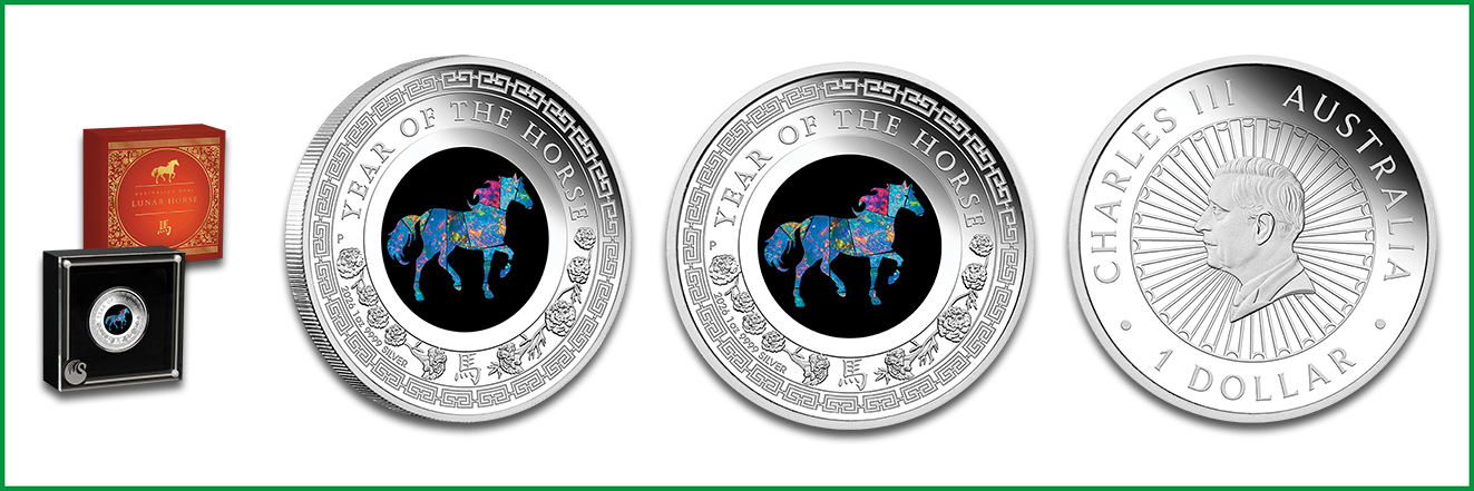 Ein weiteres Highlight ergänzt die Perth Mint mit der Silbermünze zu 1 Unze, die auf der Rückseite einen farbenprächtigen Opal im Zentrum beherbergt, das ein Pferd darstellt. Umgeben ist das Feld von geprägten Elementen wie stilisierten Ringelblumen als Glücksbringer und dem Schriftzug »Year of the Horse« sowie das chinesische Schriftzeichen für Pferd. Entwickelt wurde das Design von Aleysha Howarth. Die Vorderseite bildet King Charles III. nach Dan Thorne vor einem Strahlenhintergrund ab. Dort ist auch der Nennwert über 1 Australische Dollar (AUD) zu finden. Die Silber-Opalmünze auf polierter Platte hat eine Größe von 36,6 x 3,95 Millimeter und wiegt 31,107 Gramm. Ihr Feingehalt beläuft sich auf 999,9/1000. Verausgabt werden insgesamt 6.000 Stück im Display-Aufsteller mit Zertifikat.