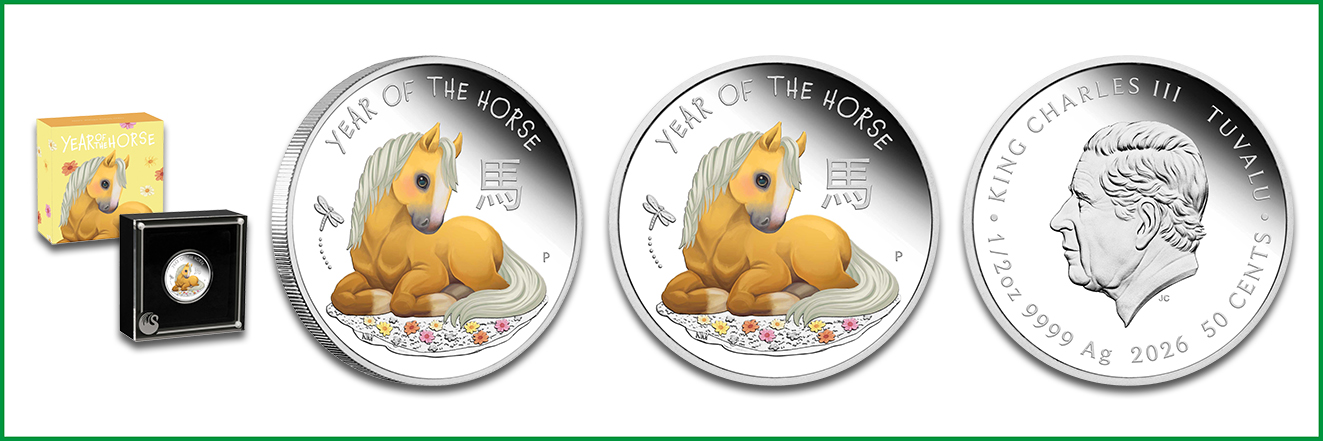 Für kleine Sammler oder als Geschenk zur Geburt empfiehlt sich die Silberfarbmünze »Baby Horse«, die auf ihrem Revers ein coloriertes Fohlen im Zeichenstil präsentiert. Es wurde von der Künstlerin Natasha Muhl kreiert. Der Avers zeigt King Charles III. nach Jody Clark, inklusive Nennwert über 0,50 Tuvalu-Dollar (TVD). Die Sammlermünze auf polierter Platte ist zu 1/2 Unze ausgeführt mit einem Feingehalt von 999,9 Tausendstel. Ihre Abmessungen belaufen sich auf 32,6 x 2,9 Millimeter. Die Gesamtauflage beträgt 7.500 Exemplare im Stand-Display mit Echtheitszertifikat der Perth Mint.