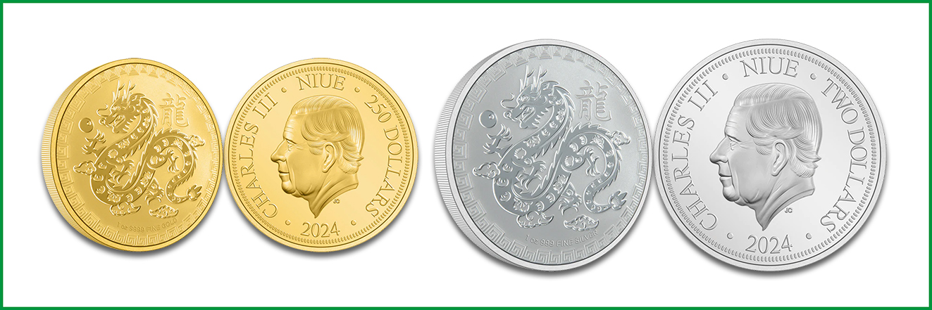 Mit dem Motiv Jahr des Drachen veröffentlicht die New Zealand Mint eine neue Anlagemünze in Gold und Silber. Sie wird für den Inselstaat Niue ausgegeben und trägt daher einen Nennwert in Neuseeland Dollar. Das Revers ziert ein Drache, der am Himmel mit einer Perle spielt vor einem Wolkenhintergrund. Das Motiv ist von einem kunstvollen Rahmen eingefasst. Die Vorderseite zeigt ein neues Bildnis von King Charles III., das von Jody Clark entworfen wurde. Sie integriert Jahrgang und Nominal. Gefertigt ist die Bullionmünze aus 999/1000 Silber sowie aus 999,9/1000 Gold. Beide Edelmetalle stehen jeweils in 1 Unze zur Verfügung. Sie können im Fachhandel einzeln oder in Tuben erworben werden bei unlimitierter Prägung.