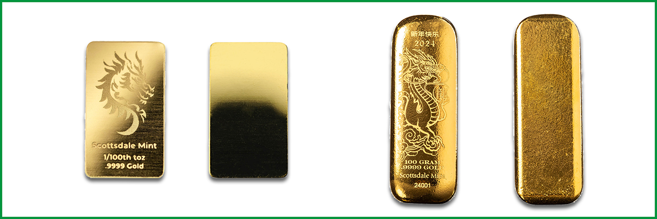 Als Alternative zum runden Münzdesign hat die Scottsdale Mint zwei Goldbarren mit Drachenmotiven herausgebracht. Dabei handelt es sich um den Lunar Dragon Prägebarren zu 1/100 Unze mit einem stilistischen Drachenmotiv. Er besitzt eine Feinheit von 999,9 Tausendstel und wird in Bullionqualität Stempelglanz ausgegeben. Die Prägemenge ist unlimitiert. Seite Abmessungen belaufen sich auf 15 x 8,9 x 0,5 Millimeter (nachfolgend vergrößerte Darstellung).