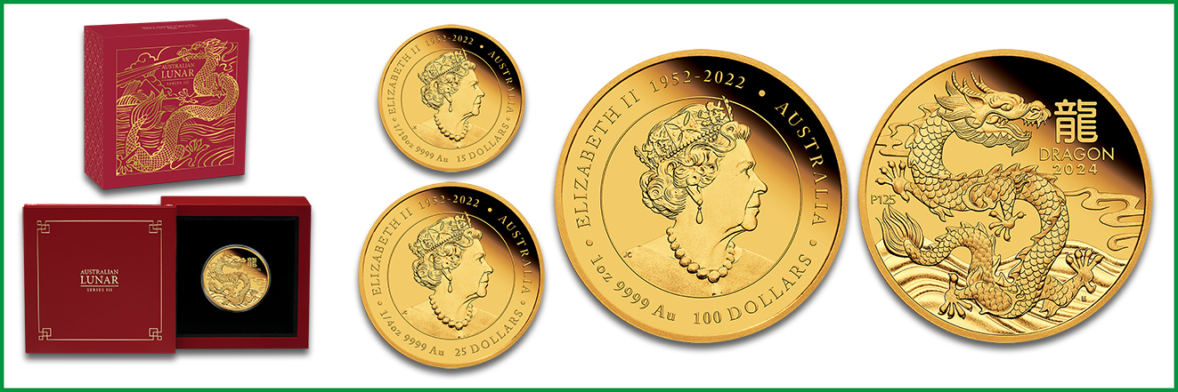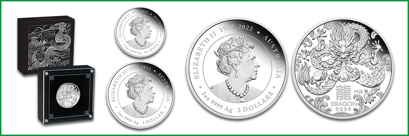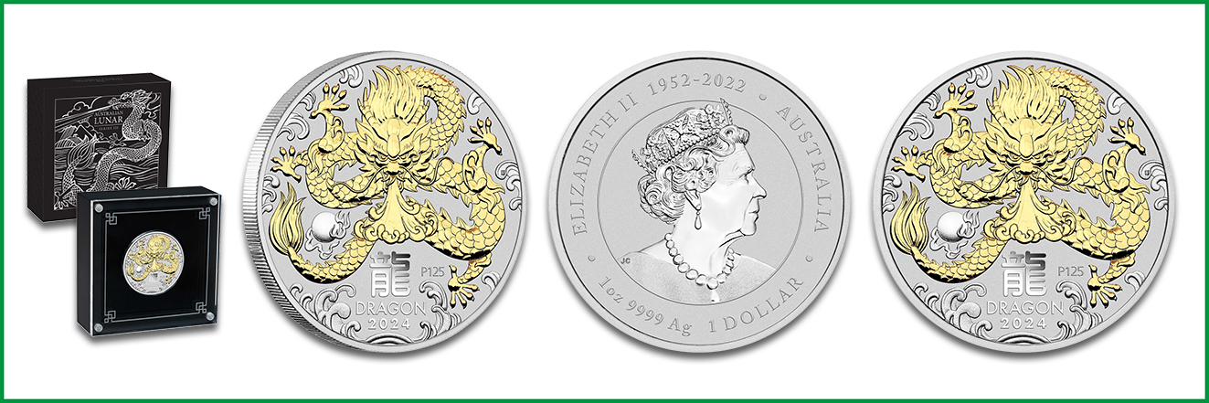 Neben den klassischen Bullionmünzen gibt die Perth Mint verschiedene Sonderprägungen aus der Serie Lunar III heraus. Dazu gehören die Gold- und Silbermünzen in Prägequalität Polierte Platte sowie die Silbermünzen mit vergoldeten und colorierten Rückseiten. Während die Silberausgaben einen sich windenden Drachen zeigen, der den Betrachter anschaut, bilden die Goldmünzen den Glücksboten im Profil ab. Eine Ausnahme stellt das farbenfrohe Motiv »Baby Dragon« dar, das ein verspieltes Drachenkind zeigt. Dieses Design eignet sich insbesondere als Geschenk zur Geburt im aktuellen Jahr. Die Vorderseiten präsentieren das Memorial Design mit Queen Elizabeth II. Das Münzzeichen P ist durch die Ziffer 125 ergänzt, wodurch das 125-jährige Jubiläum der Perth Mint gekennzeichnet ist.