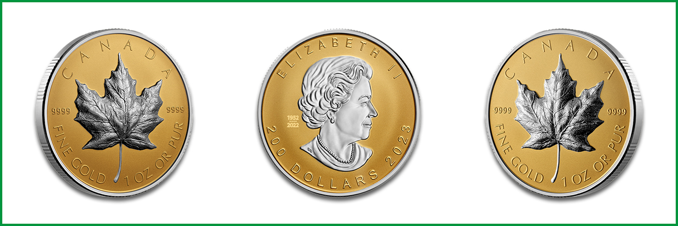 Nach der Erstausgabe 2022 bringt die RCM auch in diesem Jahr wieder eine neue Ultrahoch-Reliefmünze aus der Serie Maple Leaf heraus. Die Rückseite weist eine eindrucksvolle Reliefhöhe von 1,8 Millimeter auf. Dabei ist das bekannte Ahornblatt von Walter Ott mit einer Platinauflage überzogen. Die selektive Platinveredelung stellt eine Neuheit für das Jahr 2023 dar und erzeugt einen glanzvollen Farbkontrast auf beiden Münzseiten. Wie bei allen aktuellen Ausgaben zeigt der Avers noch das Portrait Queen Elizabeth II. von Susanna Blunt (SB). Ergänzt ist das klassische Design durch die Regentenjahre der Königin 1952 bis 2022. Die Wertseite integriert ebenfalls den Nennwert über 200 Kanadische Dollar (CAD) und das Erscheinungsjahr 2023.