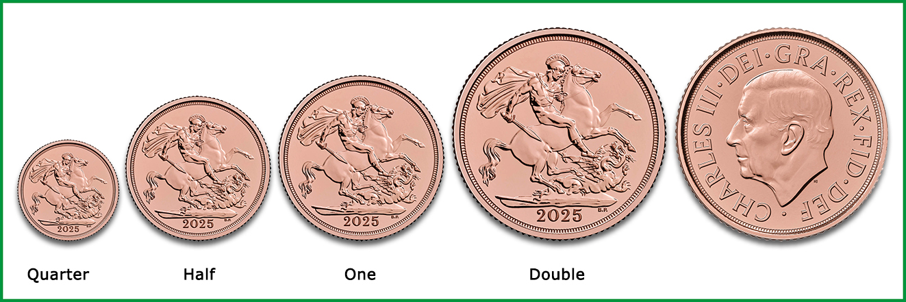 | Goldmünze Sovereign Bullion | Quarter 0,059 oz | Half 0,117 oz | One 0,235 oz | Double 0,470 oz |