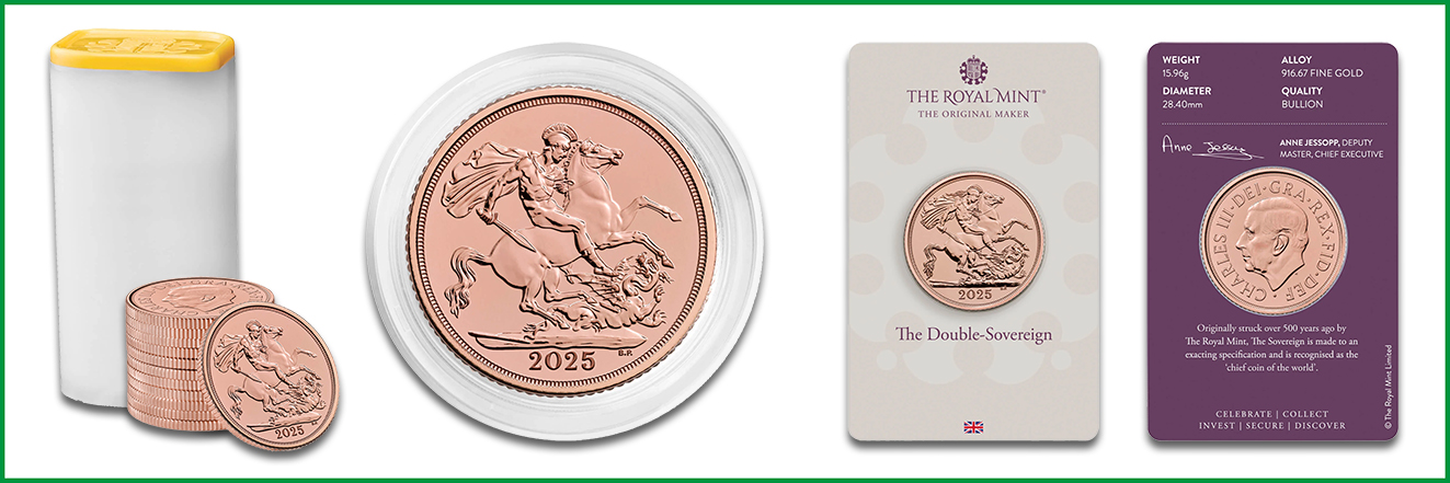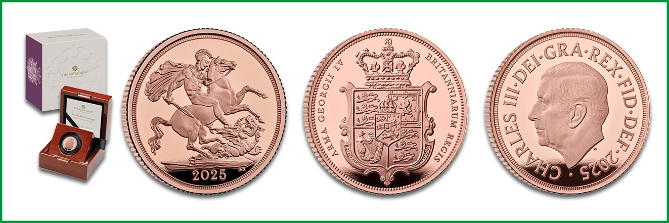 Die Gold-Bullionmünze Sovereign für den Jahrgang 2025 ist in den vier Stückelungen Quarter-, Half-, One- und Double-Sovereign verfügbar. Wobei die One-Einheit offiziell nur als “The Sovereign” bezeichnet wird. Auf der Bildseite ist ausschließlich St. Georg auf dem Pferd im Kampf gegen den Drachen zu sehen. Die Jahreszahl 2025 beschließt das Rückseitendesign, das von Benedetto Pistrucci (BP) entworfen wurde. Die Wertseite zeigt das ungekrönte Portrait von King Charles III. nach einem Entwurf von Martin Jennings (MJ) sowie den Monarchentitel als Umschrift. Wie beim Sovereign-Design üblich, wird auf weitere Angaben wie Feingehalt, Einheit oder Nennwert verzichtet.