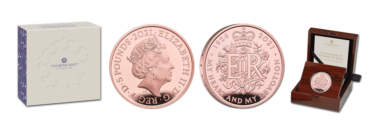 Die Ausgabe der Royal Mint zeigt auf der Rückseite ein florales Emblem, das von Wappendesigner Timothy Noad (TN) entwickelt wurde. Es trägt die britische Krone und die Buchstabenkombination »EIIR« (Elizabeth II Regina). Die Umschrift lautet: »MY HEART AND MY DEVOTION« aus der TV-Weihnachtsbotschaft der Queen von 1957. Ergänzt ist das Geburtsjahr der Monarchin sowie das aktuelle Jahr 2021. Die Vorderseite bildet das 2019er-Portraitrelief der Queen von Jody Clark (JC) mit Umschrift und Münzdaten ab.