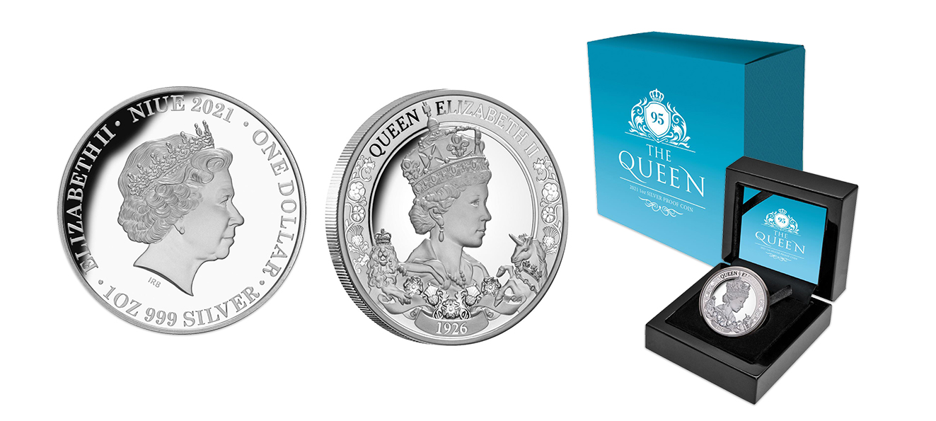 Mit zwei weiteren Sonderausgaben huldigt die New Zealand Mint 2021 ebenfalls den 95. Geburtstag der britischen Königin. Es handelt sich um eine Silbermünze und eine Goldmünze, die identische Motive aufweisen. Während der Avers klassisch das offizielle Portrait der Queen von Ian Rank-Broadley mit Umschrift zeigt, erscheint auf dem Revers das Bildnis der jungen Monarchin am Tag ihrer Krönung 1963 in Westminster Abbey.