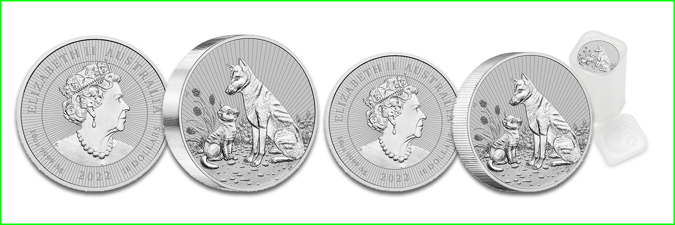 Das Motiv für 2022 ist dem Dingo gewidmet, einem in Australien weitverbreiteten Wildhund. Wie für diese Serie typisch, ist ein Muttertier mit Jungem dargestellt – die nächste Generation. Neben der naturgetreuen Wiedergabe der Hunde besticht das Münzdesign insbesondere durch die eleganten radialen Linien im Hintergrund, die sich ebenfalls auf dem Avers befinden. Außer dem Kürzel AH für die Künstlerin Aleysha Howarth sowie dem Prägezeichen P (für Perth Mint) ist der Revers ganz dem Motiv vorbehalten. Die Vorderseite zeigt das Queen-Portrait mit allen Wertangaben. Die Münzen sind einzeln oder in der Münztube (nur 2 oz) erhältlich.