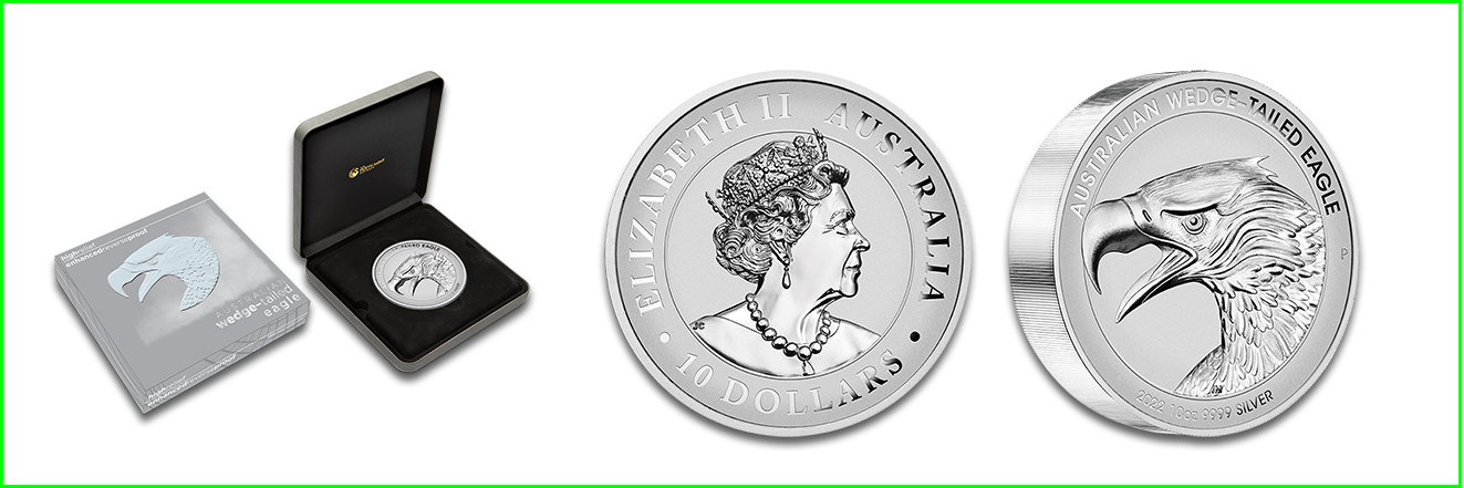 Mit der im Wortsinne herausragenden Sonderausgabe gibt die Perth Mint eine Ultrahoch-Reliefmünze (enhanced reverse high relief) des Wedge-Tailed Eagle heraus. Die Serie erscheint seit 2014 mit jährlich wechselnden Motiven des australischen Keilschwanzadlers. In diesem Jahr ist der Kopf eines mächtigen Adlers mit aufgerissenem Schnabel zu sehen. Der Avers stellt das Abbild Königin Elisabeth II. dar mit Umschrift und Nennwert über 10 Australische Dollar.