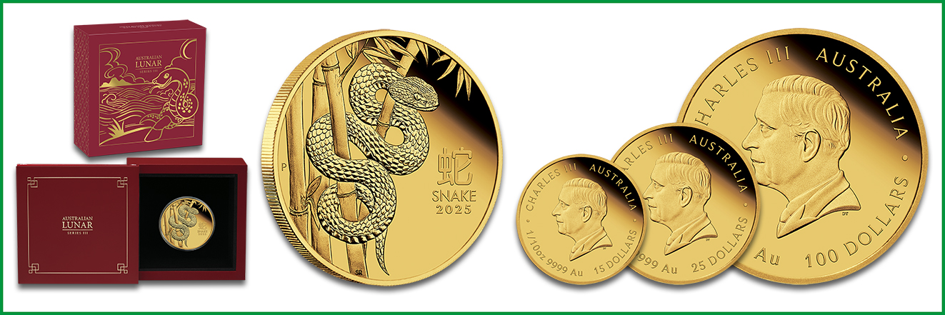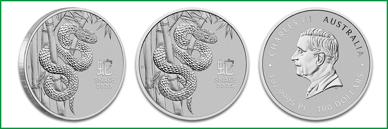 Lunar Serie III erscheint seit 2019 mit jährlich wechselnden Motiven aus den Mondtierkreiszeichen. Sie folgt auf Lunar Serie II und Lunar Serie I, die erstmals 1996 verausgabt wurde. Jede Folge besteht aus zwölf festgelegten Tiermotiven aus der chinesischen Mythologie. So ist 2025 das Jahr der Schlange. Dargestellt ist auf der Gold- und Platinmünze ein detailreiches Reptil, das sich um mehrere Bambusstämme windet. Bei der Silberausgabe schlängelt sich das Kriechtier auf dem Boden unter herabhängenden Blättern. Das Zodiac-Symbol der Schlange steht für Weisheit, Intelligenz, Unabhängigkeit und Charme. Ergänzt sind die Rückseitendesigns durch die Bezeichnung »Snake« in chinesischen und englischen Schriftzeichen in Kombination mit dem Jahrgang. Die Motive wurden von Sean Rogers (SR) entworfen. Auf der Wertseite aller Münzen ist das Portrait von King Charles III. nach Dan Thorne mit den Münzdaten und dem Nennwert in Australische Dollar als Umschrift abgebildet.
