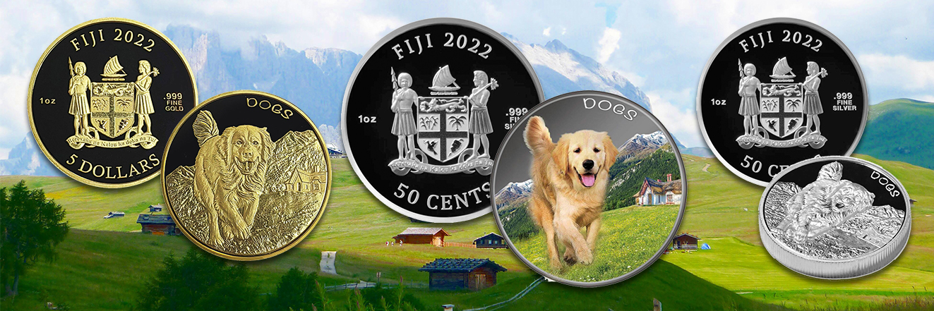 | Fiji Dogs 2022 (Motiv Golden Retriever) | Goldmünze | Silbermünze coloriert | Silbermünze Hochrelief |