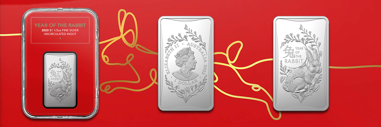 Darüber hinaus verausgabt die RAM einen Silbermünzbarren zu 1/2 Unze aus der Serie Lunar II mit dem Motiv Jahr des Kaninchens. Er besteht aus 999 Tausendstel Silber und besitzt eine elegant gefrostete Veredelung. Der Münzbarren hat die Abmessungen 41 x 24 Millimeter und ist mit einem Nennwert über 1 AUD ausgestattet. Seine Auflage umfasst 10.000 Stück, die einzeln in der thematischen Acrylkapsel verausgabt werden.