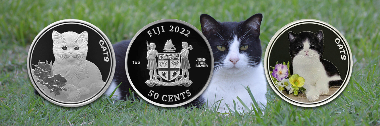Die Silbermünze und Silberfarbmünze Fiji Cats besteht aus 999/1000 Silber und wird in Prägequalität Spiegelglanz ausgegeben. Beide Münzen sind ausschließlich in der Stückelung zu einer Feinunze verfügbar. Der Nennwert beträgt jeweils 50 Cents. Da es sich um Agenturausgaben handelt, werden die Münzen für die Republik Fiji (auch Fidschi genannt) ausgegeben. Der Staat liegt im Südpazifik und umfasst mehr als 300 Inseln. Die Landeswährung sind Fidschi-Dollar, dabei entspricht ein FJD etwa 0,45 Euro. Passend dazu ist die Wertseite mit dem Landeswappen im Zentrum gestaltet. Sie umfasst ebenfalls alle Münzdaten.