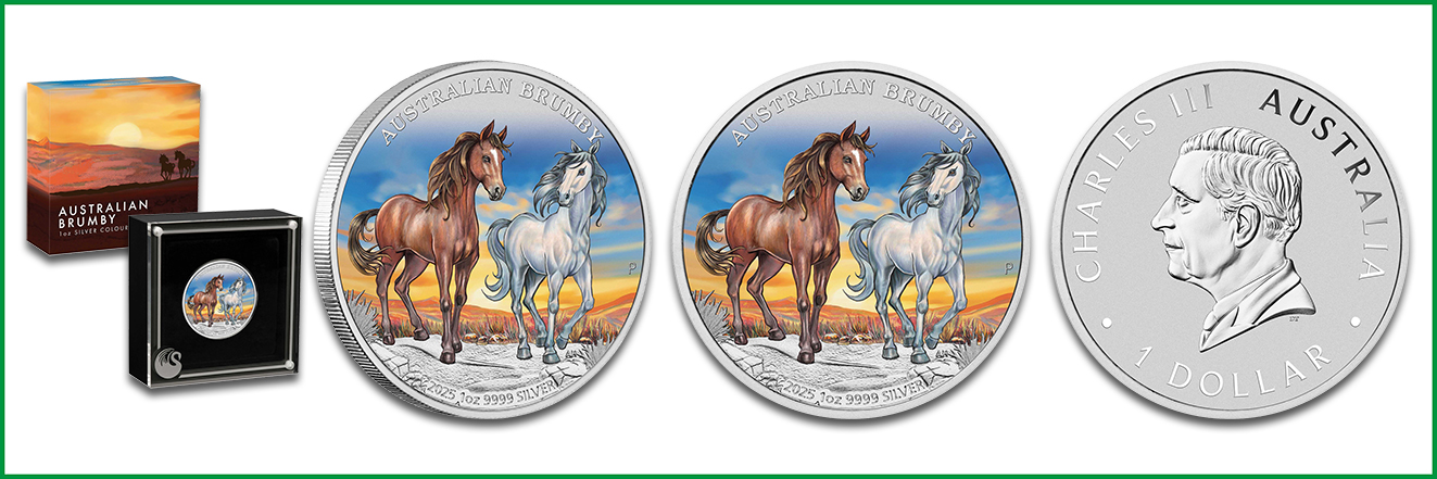 Mit der fünften Ausgabe setzt die Perth Mint ihre 2020 begonnene Reihe Australian Brumby fort. Das 2025er-Motiv zeigt zwei australische Wildpferde in der Steppe vor einem eindrucksvollen Sonnenuntergang. Ergänzt ist das Design von Aleysha Howarth durch den Seriennamen und die Feindaten der Münze. Die Silberfarbmünze zu einer Unze stellt auf Ihrer Wertseite das Portraitemblem mit King Charles III. nach Dan Thorne dar. Der Nennwert beläuft sich auf 1 Australische Dollar.
