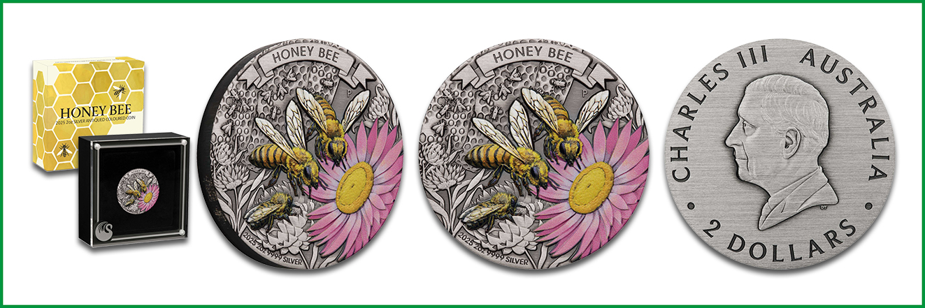 Im eleganten Antik-Design präsentiert sich die Silberfarbmünze »Honey-Bee« aus dem Perth Mint-Sammlerprogramm, die den westlichen Honigbienen gewidmet ist. Das farbenfrohe Rückseitenmotiv von Jennifer McKenna stellt zwei Arbeiterbienen dar, die Nektar von einer rosafarbenen Margeritenblüte sammeln. Im monochrom gehaltenen Hintergrund sind weitere Honig-verarbeitenden Bienen sowie Blüten und Waben zu sehen. Ein Spruchband mit dem Münznamen verziert den Münzhimmel, während die Feindaten dezent im Münzboden integriert sind. Die Wertseite ist wie der Revers randlos ausgeführt. Sie zeigt in ihrem Zentrum das Konterfei von König Charles III. nach Dan Thorne, gemeinsam mit dem Titel des australischen Staatsoberhaupts und dem Nennwert über 2 AUD. Durch die aufgeräumte Gestaltung der Wertseite kommt die feine Struktur der handgefertigten Antikveredelung besonders schön zur Geltung.