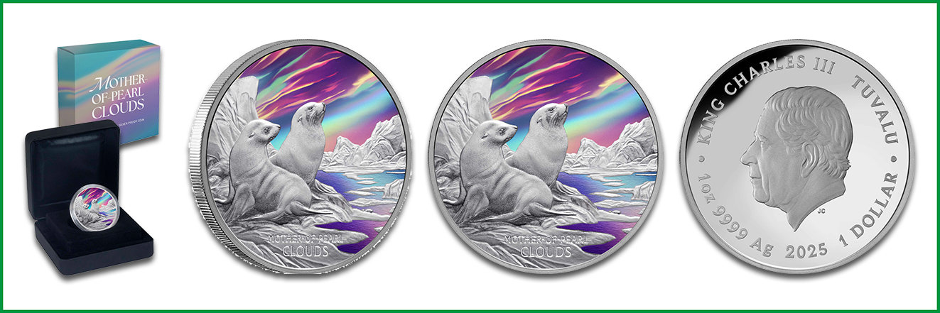 Ein weiteres Sammlerstück bringt die Perth Mint mit der Silberfarbmünze »Mother-of-Pearl Clouds« heraus. Auf der Bildseite tummeln sich zwei Seelöwen auf einem Gletscher. Sie sind von Eisbergen umgeben. Der Fokus des Münzdesigns liegt hier jedoch im Hintergrund. Dieser zeigt das außergewöhnliche Phänomen von Perlmuttwolken, wie sie im Winter in der Polarregion zu sehen sind. Sie bestehen aus winzigen Eiskristallen. Im Zusammenspiel mit dem Sonnenlicht entsteht ein einzigartiges Naturschauspiel, das die Wolken in schillernde Farben taucht. Im Münzdesign spiegelt sich das Farbspektakel im Eiswasser. Dezent wurde der Münzname im Gletschereis integriert. Auf der Wertseite ist King Charles III. nach Jody Clark abgebildet, zusammen mit den Feindaten der Münze sowie dem Nennwert über 1 Tuvalu-Dollar (TVD). Der Inselstaat im Pazifik ist offizielles Ausgabeland der Münze.