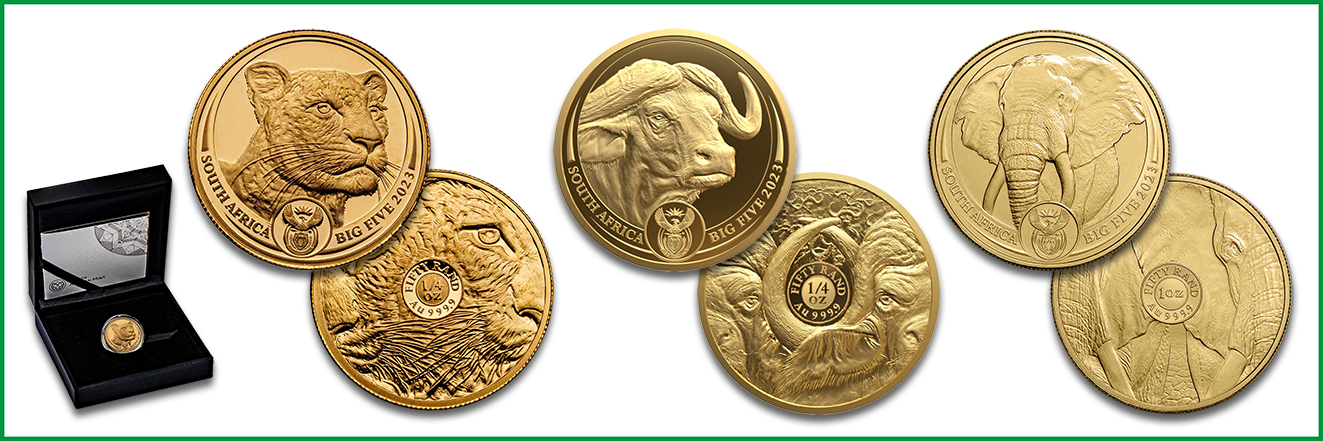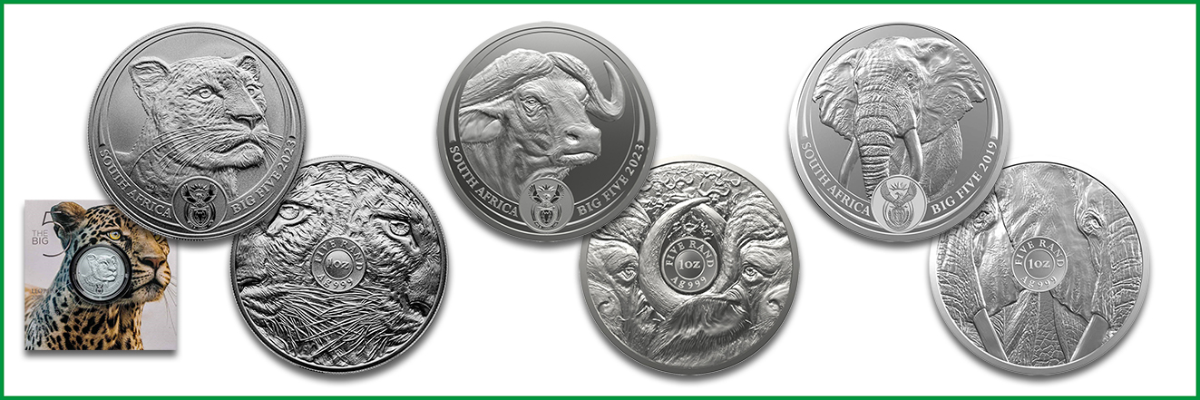 Seit 2019 bringt die South African Mint die Münzserie Big Five heraus. Sie ist den fünf größten und bekanntesten Tieren aus Südafrika gewidmet. Inzwischen erscheint die Serie II mit den Motiven Leopard, Büffel und Elefant, die für 2023 bereits ausgegeben wurden. Verfügbar sind die Tierdesigns als Goldmünze, Silbermünze und Platinmünze. Es handelt sich immer um die gleichen Tiere, doch von Serie zu Serie variieren die Motive. Als Besonderheit fügen sich die Wertseiten zwei gleicher Münzen zu einem Motiv zusammen. Der Nennwert ist in Südafrikanische Rand (ZAR) angegeben.