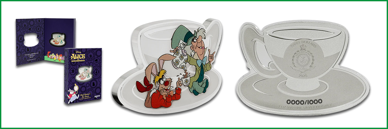Die colorierte Formmünze zu 2 Unzen zelebriert die chaotische Teeparty des verrückten Hutmachers und des Märzhasens aus Disneys Alice im Wunderland. Sie hat die Form einer Teetasse mit Untertasse, die in Silber gehalten ist. Passend zum Motiv ist die Münze mit Zuckerguss und Spiegelglanz versehen. Die offiziell von Disney lizenzierte Silberfarbmünze zeigt auf der Wertseite das Landeswappen von Niue sowie eine fortlaufende Seriennummer. Der Nennwert beläuft sich auf 3 Neuseeland-Dollar. Zum Einsatz kommt ein Silberfeingehalt von 999 Tausendstel. Die Abmessungen betragen 37 x 52 Millimeter.