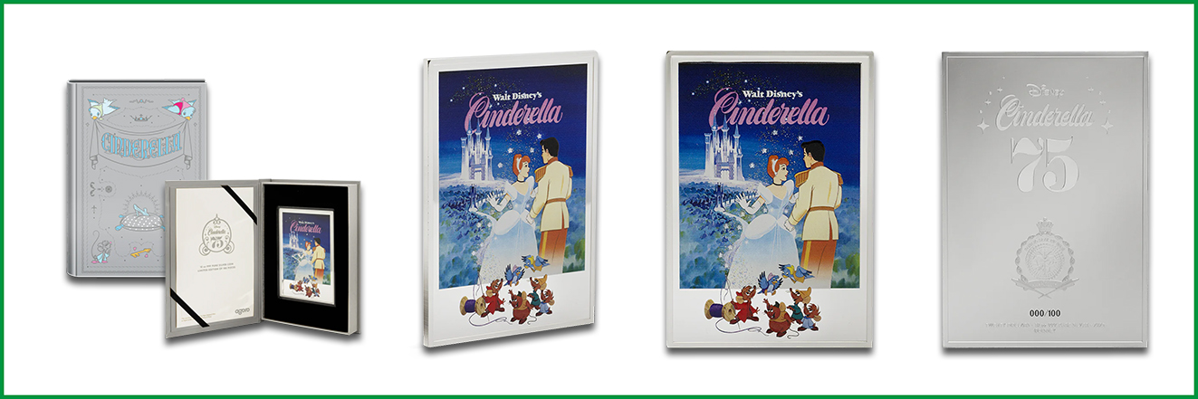 Der Zeichentrickklassiker Cinderella stellt beliebte Figuren von Disney in den Fokus. Zu Ehren des 75. Filmjubiläums erscheint die Poster-Münze mit dem orignalen Filmplakat zur Wiederaufführung im Jahr 1981. Der Farbdruck zeigt Disneys Prince Charming, Prinzessin Cinderella und ihre tierischen Freunde vor ihrem Schloss. Dazu sind zwölf funkelnde Edelsteine in die Münze eingelassen, welche die Sterne symbolisieren. Ausgeführt ist die rechteckige Münze mit einem glänzenden Spiegelhintergrund und mattiertem Rand. Die Vorderseite integriert das Filmjubiläum sowie das Landeswappen von Niue und eine Seriennummer.