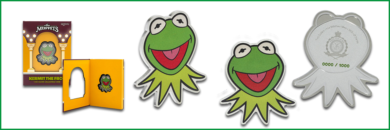 Miss Piggys große Liebe ist Kermit der Frosch. Also darf dieses farbenfrohe Motiv in der Disney Muppets-Serie nicht fehlen. Die Formmünze zeigt die Froschfigur mit seinem charakteristischen Kragen und den runden Kuppelaugen, die oben über den Münzrand ragen. Auch hier ist die Bildseite ohne Beschriftung gehalten. Die technischen Daten sind zusammen mit dem Staatswappen von Niue und dem Nennwert auf dem Avers untergebracht. Dort ist auch die einzigartige Seriennummer als eine von 1.000 Exemplaren vorhanden. Präsentiert wird die Silberfarbmünze in einer Verpackung zum Aufklappen mit Muppets-Motiv und Sichtfenster. Ein Echtheitszertifikat ist auf der Rückseite aufgedruckt.