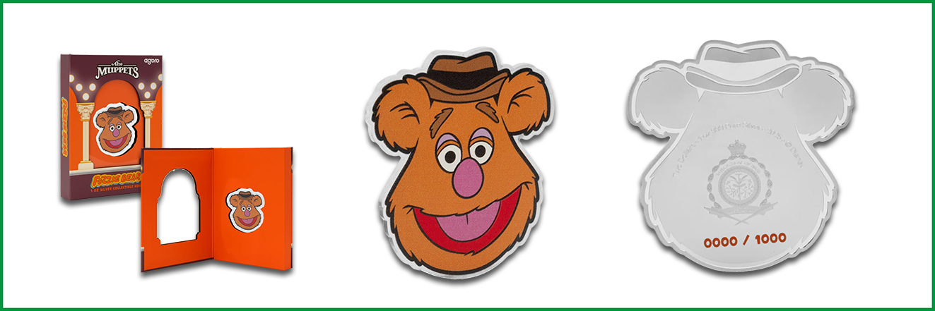 Mit dem Motiv Fozzie Bear erscheint eine weitere Shaped-Silbermünze aus der Muppets-Reihe. Sie stellt den Kopf der beliebten Bärenfigur dar, bei dem der charakteristische Pork Pie-Hut nicht fehlen darf. Abgerundet wird das farbige Design durch den mattierten silbernen Rand. Auf der Vorderseite sind die Konturen von Fozzie-Bär sowie die Linienführung seines Huts zu erkennen. Das Siegel von Niue weist die colorierte Münze als gesetzliches Zahlungsmittel aus. Die aufgeprägten technischen Daten werden durch die Seriennummer komplettiert. Verausgabt werden die Silberfarbmünzen in einer thematischen Sichtfensterverpackung mit Zertifikat.