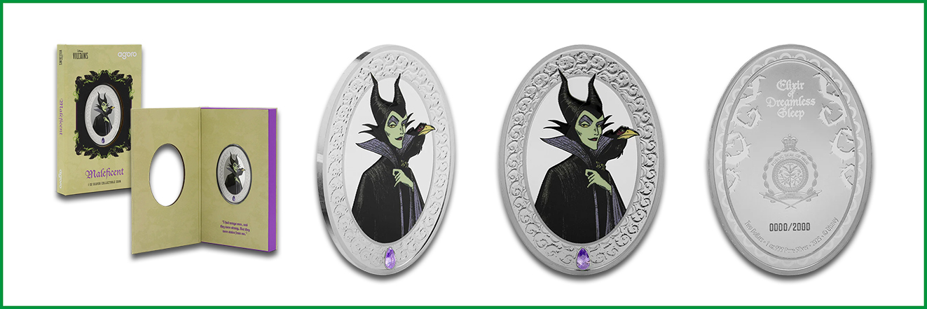 Als Auftakt der Reihe mit Bösewichten von Disney erscheint das Motiv Maleficent. Die Herrin des Bösen wird in einem auffälligen Kameo-Stil in Farbe und als Relief vor einem spiegelnden Hintergrund dargestellt. Ein mattierter Rand mit dornähnlichen Ornamenten umrahmt die Teufelin auf der Bildseite. Ergänzt ist das Design durch einen violetten Edelstein, der in den Rand eingelassen ist. Die Wertseite mit dem Nennwert über 2 Neuseeland-Dollar und dem Niue-Siegel ist vollständig in Silber ausgeführt. Zudem ist eine Seriennummer aufgeprägt.