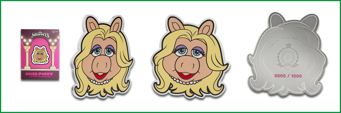 Aus der fünfteiligen Muppets-Kollektion erscheint die Shaped-Silberfarbmünze Miss Piggy. Die Formmünze stellt auf ihrer Rückseite den Kopf der beliebten Muppets-Figur dar, mit blondem Haarschopf, Perlenkette und rotem Lippenstift. Die Figur ist vollständig mit einem Farbdruck versehen, während der schmale umlaufende Rand silber gehalten und mattiert ist. Das Haar erscheint in Spiegelglanz. Der Revers ist komplett dem Motiv vorbehalten und ohne jede Beschriftung ausgeführt. Alle technische Daten sowie der Nennwert über 2 Neuseeland-Dollar (NZD) sind auf der Vorderseite rund um das Landeswappen des südpazifischen Inselstaats Niue angeordnet. Dort ist ebenfalls eine Seriennummer vorgesehen. Die limitierte Auflage beträgt nur 1.000 Stück. Verausgabt wird die colorierte Silbermünze einzeln in einem aufklappbaren Display-Etui, das ebenfalls ein nummeriertes Echtheitszertifikat beinhaltet. Sehen Sie weitere technische Daten in der Tabelle unten.
