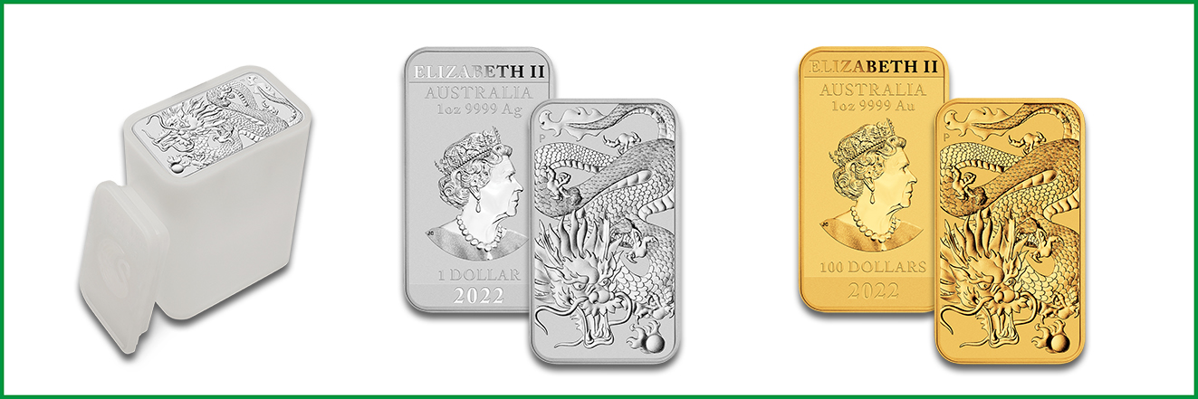 Die Münzbarren aus der beliebten Serie Dragon Rectangular werden seit 2018 von der Perth Mint in Gold und Silber zu je einer Unze ausgegeben. Dabei handelt es sich um aufwendig gestaltete Münzen in rechteckiger Barrenform. Auf der Bildseite ist ein detailliertes Drachenmotiv dargestellt. Lediglich das Münzzeichen P sowie die Initialen des Künstlers sind dezent in die Gestaltung integriert. Die Wertseite zeigt das Abbild der verstorbenen Queen Elizabeth II. Weiterhin sind Feingehalt, Nennwert und Jahrgang Teil des Designs. Anders als klassische Barren sind diese Münzbarren als offizielle Zahlungsmittel in Australien anerkannt. Neben der Bullionqualität in Stempelglanz wird ebenfalls eine Sammlerversion auf Polierter Platte erhältlich sein. Motiv und Erscheinungsdatum werden in diesem Jahr verspätet erst im Juni 2023 bekannt gegeben.