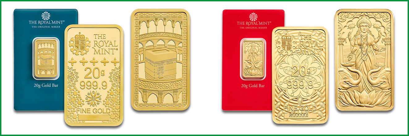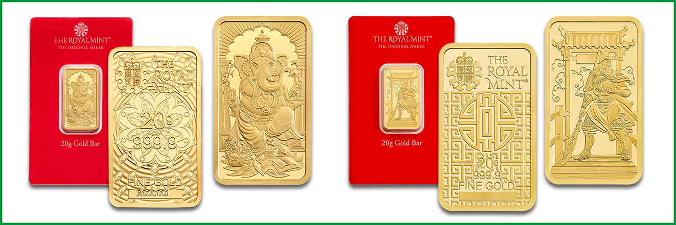 Aus der Serie mit 20 Gramm-Prägebarren verausgabt die britische Prägestätte Royal Mint eine Reihe mit fernöstlichen Motiven. Dabei handelt es sich um Bullionbarren für Anleger, die sich aufgrund ihrer aufwendigen Gestaltung ebenfalls für Sammler eignen. So symbolisiert die Ausgabe »Ganesh« den gleichnamigen Hindugott in Gestalt eines Elefanten, der als Herr des Anfangs bezeichnet wird. Ebenso sehenswert ist der Goldbarren »Guan Gong«. Dargestellt ist der kriegerische Beschützer, der in der China auch Kaiser Guan oder Guan Yunchang genannt wird und Glück und Reichtum bringen soll.