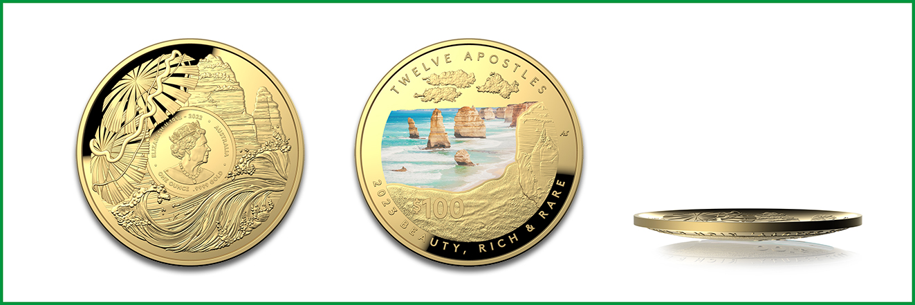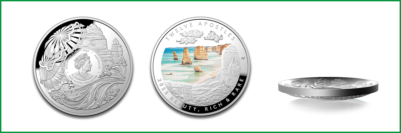 Aus der noch recht jungen Münzserie »Beauty, Rich & Rare« veröffentlicht die Royal Australian Mint (RAM) nun das von Aleksandra Stokic entwickelte Motiv Twelve Apostles, das als Gold- und Silberfarbmünze im gewölbten Design erscheint. Dabei ist die Bildseite mit dem Farbelement der Zwölf Apostel (Kalksteinfelsen vor der Küste Victorias) nach außen gewölbt, während die Wertseite eine Innenwölbung besitzt. Sie zeigt in ihrem Zentrum das Abbild Queen Elizabeth II. von Jody Clark, eingebettet in eine Küstenszene.