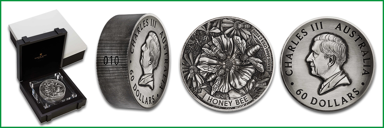 Die australische Prägestätte Perth Mint verausgabt mit dem Design Honey Bee eine neue spektakuläre Silbermünze im Antik-Finish zu 2 Kilogramm. Dabei handelt es sich um eine Hochreliefausführung, die eine Gesamttiefe von 36,3 Millimeter aufweist. Dabei erscheinen Avers und Revers jeweils nach innen gewölbt mit erhabenen Motiven. Seit 2019 wird die 2 Kilo-Serie mit wechselnden Abbildungen herausgegeben. Der Durchmesser beläuft sich auf 101,3 Millimeter. Dadurch ergeben sich 64,301 Unzen zu einem Feingehalt von 999,9/1000. Der Nennwert beläuft sich auf 60 Australische Dollar (AUD). Die streng limitierte Auflage umfasst 200 Stück, die einzeln im Displayetui mit nummeriertem Echtheitszertifikat verausgabt werden.
