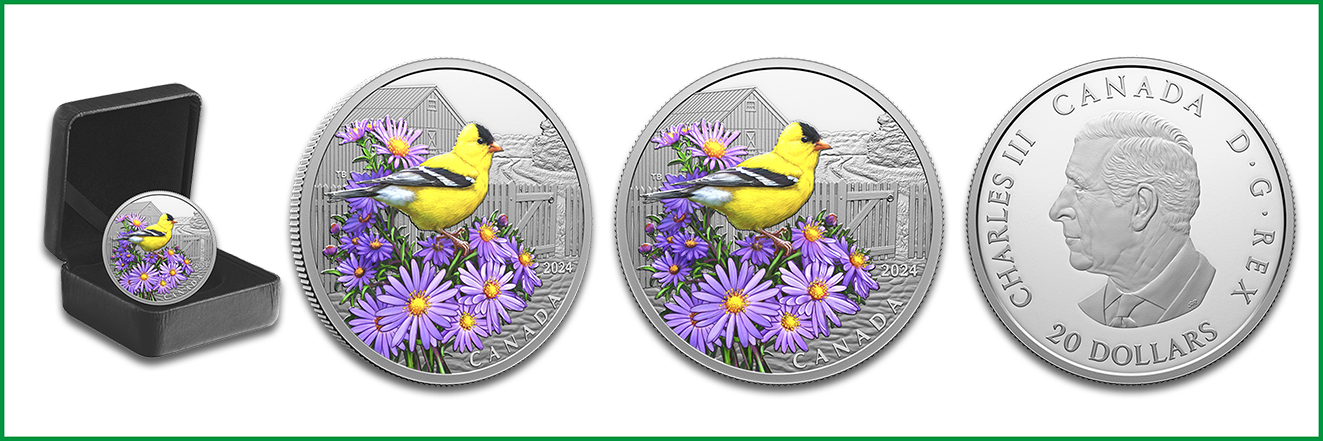 Aus der Serie Colourful Birds gibt die Royal Canadian Mint nunmehr die vierte Ausgabe der eleganten Silberfarbmünzen heraus. Ihr Rückseitenmotiv ist dem amerikanischen Stieglitz gewidmet. Der gelbschwarze Fink sitzt in einem Garten auf violettfarbenen Asternblüten. Ergänzt wird das Design von Tony Bianco (TB) durch die Jahreszahl 2024 und den Schriftzug Canada. Die silberfarbene Wertseite wurde von Steven Rosati gestaltet und zeigt King Charles III. mit Titel, Ausgabeland und Nennwert über 20 Kanadische Dollar (CAD).