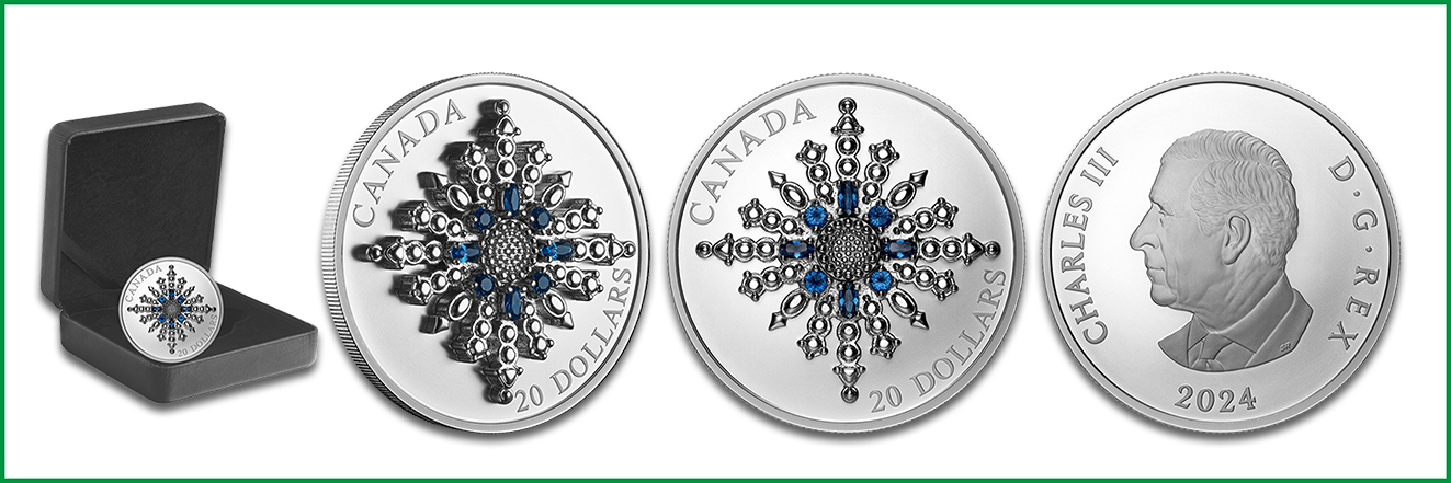 Mit dem Motiv »Sapphiere Jubilee Snowflake Brooch« startet die Royal Canadian Mint die neue Crown Jewels-Serie. Dabei handelt es sich um eine Münzreihe, welche die kostbaren Kronjuwelen des Commonwealth of Nations präsentiert. Die Erstausgabe ist der Brosche gewidmet, die Queen Elizabeth II. anlässlich ihres 65. Thronjubiläums durch das kanadische Volk überreicht wurde. Das Original zeigt eine mit Diamanten und Saphiren besetzte Schneeflocke als Symbol für die kanadische Arktis. Die Schmucksteine auf der Münze bestehen aus königsblauen Glassteinen und Gusselementen aus Rhodium. Das Grunddesign ist aus 999,9/1000 Silber auf einer Polierten Platte mit mattierter Oberfläche geprägt.