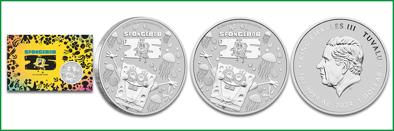 Zum 25. Jubiläum der US-amerikanischen Zeichentrickserie SpongeBob Schwammkopf präsentiert die Perth Mint eine Silbermünze als Erinnerungsstück. Sie zeigt auf ihrer Rückseite SpongeBob mit erhobenen Armen in Kombination mit dem Jubiläumslogo. Weiterhin sind Unterwasserblasen und Quallen zu sehen, die der Schwammkopf gerne mit dem Netz fängt. Entwickelt wurde das Design von Jennifer McKenna unter offizieller Lizenz. Den Avers ziert das Konterfei von King Charles III. in der Gestaltung von Jody Clark. Ergänzt ist der Nennwert über 1 Tuvalu-Dollar (TVD). Der Inselstaat im Südpazifik fungiert als Ausgabeland.