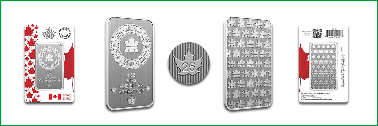 Die Royal Canadian Mint bringt einen neuen Silberbarren in Premium-Bullionqualität heraus. Es handelt sich um einen beidseitig geprägten Barren zu einer Feinunze. Das neue Design zeigt auf seiner Vorderseite ein rundes Emblem mit einem stilistischen Ahornblatt im Zentrum. Ein reich verzierter Ring trägt die zweisprachige Umschrift »ROYAL CANADIAN MINT : MONNAIE ROYALE CANADIENNE«. Darunter sind die Feindaten des Barrens ergänzt sowie drei geprägte Ahornblätter. Als besonderes Sicherheitsmerkmal trägt das größere Ahornblatt eine Lasergravur mit der Zahl 25. Der Hintergrund weist ein gerade verlaufenes Linienmuster auf, das gleichzeitig als Designelement fungiert. Es findet sich ebenfalls auf der Rückseite des Bullionbarrens wieder, die das stilistische Ahornblatt als gleichmäßiges Muster darstellt. Der Rand ist glatt gehalten.