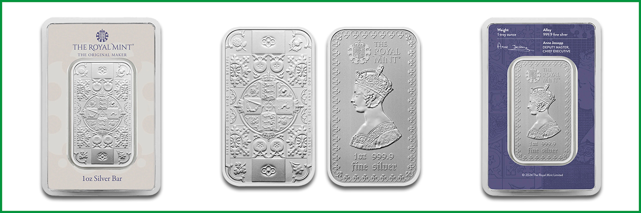 Ebenfalls neu im Programm der Royal Mint ist der Silberbarren »The Gothic Crown. Er verkörpert das zeitgenössische Design der gotischen Krone Englands, das 1847 von Meisterhandwerker William Wyon entwickelt wurde. So zeigt die Vorderseite des Anlagebarrens das gekrönte Haupt von Königin Victoria, zusammen mit dem mittelalterlichen Schriftbild der Feindaten und einer Umrandung aus Kleeblättern auf strukturiertem Grund. Das Rückseitenmotiv stellt das geviertelte königliche Wappenschild dar mit der Inschrift »TUEATUR UNITA DEUS ANNO DOM MMXXIV«.