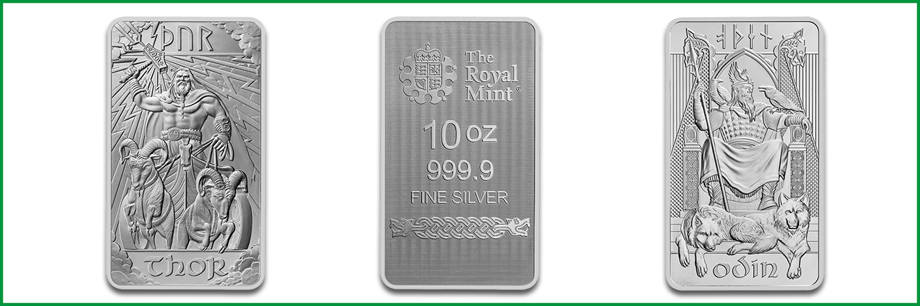Mit dem Silberbarren »Thor« setzt die britische Royal Mint die 2024 gestartete Serie der Motivbarren mit nordischen Göttern fort. Neben dem 20 Gramm-Goldbarren und dem 1-Unzen-Silberbarren kommt nun den Silberbarren zu 10 Unzen dazu. Das Motiv von Dan Thorne zeigt auf seiner Rückseite Thor, den mächtigen Gott des Donners auf einem Streitwagen mit seinem Blitze-sprühenden Hammer. Es folgt auf das 2024er-Motiv Odin, Thors Vater. Die Vorderseite integriert das Logo der Royal Mint sowie die Feindaten des Silberbarrens.