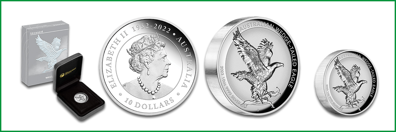 Erhältlich ist die vertiefte Silbermünze in den Einheiten zu 1 und 10 Unzen. Die limitierten Auflagen erscheinen einzeln gekapselt im hochwertigen Klappetui mit thematischer Umverpackung und nummeriertem Echtheitszertifikat. Weiterhin sind der Gold Wedge-Tailed Eagle sowie der Platin Wedge-Tailed Eagle als gängige Anlagemünze verfügbar.