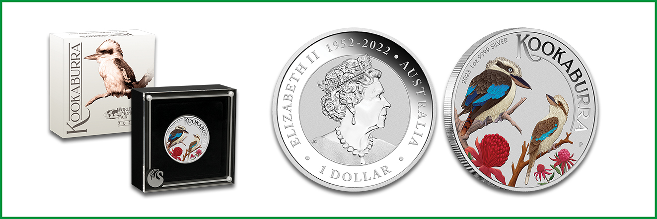 Bereits seit 1990 kommt die Silber-Anlagemünze Australian Kookaburra auf den Markt. Sie ist dem australischen Eisvogel – hierzulade auch Jägerlieste genannt – mit dem buschigen Gefieder und dem langen Schnabel gewidmet. Das Motiv des Jahrgangs 2023 wurde von Wade Robinson (WR) gezeichnet. Es zeigt zwei Vögel in klassischen Posen, die in Ästen sitzen und von Waratah-Blumen umgeben sind. Den Rahmen bildet der Münzname und die dezent angeordneten Daten der Münze. Der Avers wird vom Bildnis der australischen Königin geziert – in dieser Darstellung jedoch ohne ihre Regentschaftsjahre.