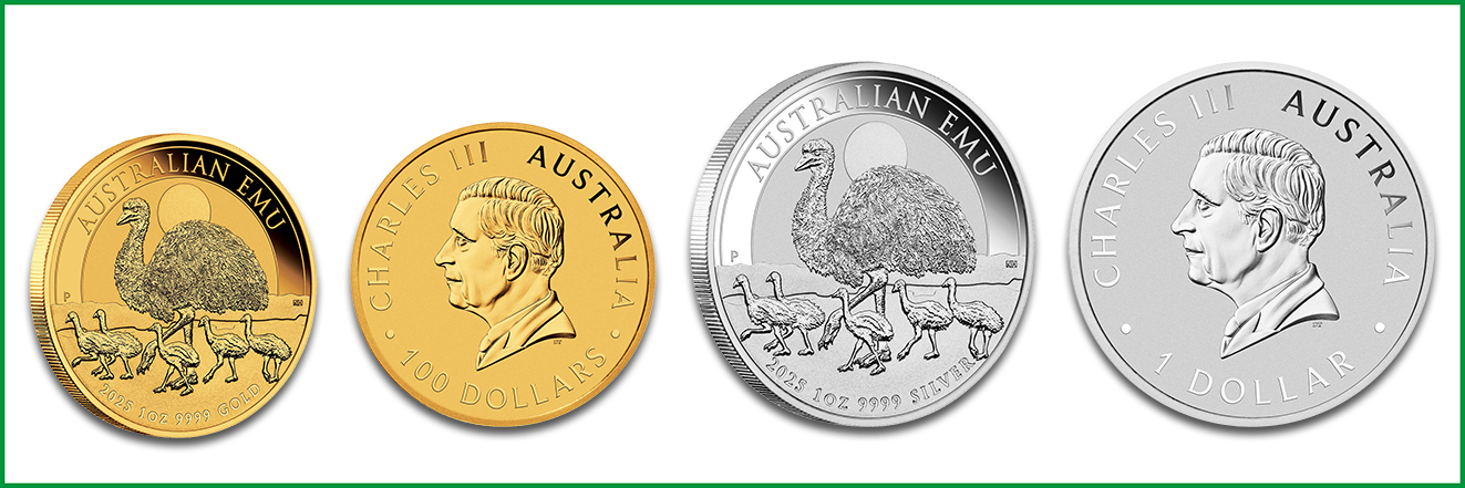 Seit 2018 gibt die australische Münzprägestätte Perth Mint die Bullion-Serie Australian Emu mit jährlich wechselnden Motiven heraus. Die Bildseite ist den zweitgrößten Laufvögeln der Welt gewidmet. Das 2025er-Design von Neil Hollis (NH) zeigt ein erwachsenes Emu mit fünf Küken in der australischen Steppe vor einem Sonnenball. Abgrenzend vom Motiv erscheint der Münzname als Umschrift. Die Feindaten sind im Münzboden integriert. Der Avers zeigt das Abbild König Charles III. nach einem Motiv von Dan Thorn mit dem Nennwert in Australische Dollar.